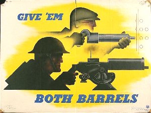 Give 'em Both Barrels Issued in 1941 by the Office of Emergency Management; Division of Information Measures: 20x15 Artist: Jean Carlu Our section: Homefront - Factory Production GIN: 0207-50