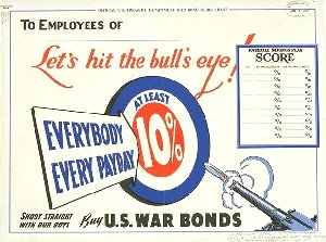 Let's Hit the Bull's Eye Measures approx. 14" x 20" Great fund raiser where you fill in which company it's used for. Issued in 1942 by the U.S. Dept. of the Treasury. Our section: Homefront - Financial GIN: 1646-60