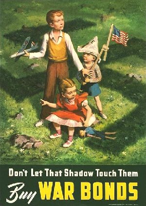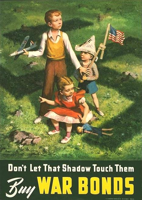 Don't Let That Shadow Touch Them Issued in 1942 by the U.S. Dept. of the Treasury. Measures: Issued in 2 sizes Sm - 14" x 20" Lg - 28"x40" Artist: Lawrence B. Smith Our section: Homefront - Financial GIN: 1646-75 17-0686 ARC: 513572