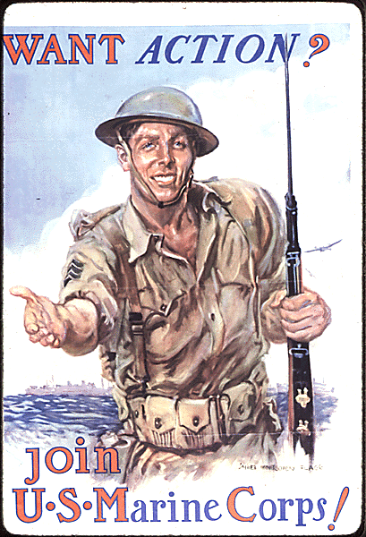 Want Action? Join U.S. Marine Corps! Issued: 1942 by the Department of Special Services Measures: Artist: James Montgomery Flagg Our section: Recruiting Men - Marines GIN: 17-0647 ARC: 513532