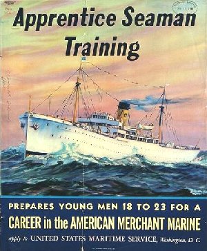 Apprentice Seaman Training Measures approx. 14" x 17" Artist: John D. Wisinsky Issued 1941 by the U.S. Maritime Service Our section: Recruitment - Men - Merchant Marine GIN: 1646-83
