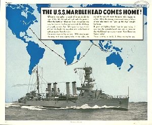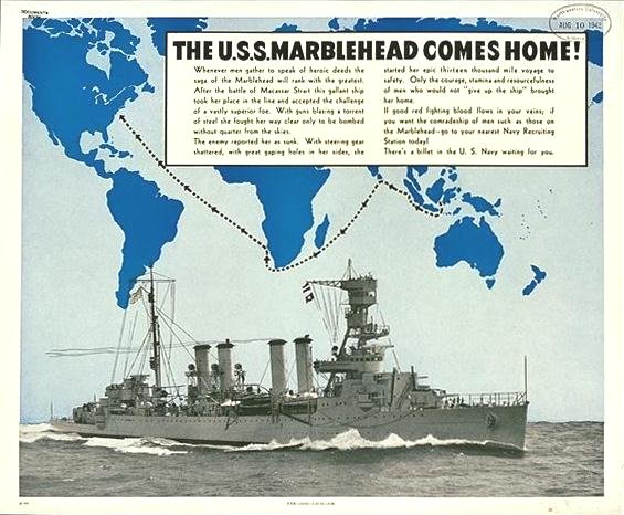 The U.S.S. Marblehead Comes Home! Measures approx. 14" x 17" Issued in 1942 by the U.S. Bureau of Naval Personnel. Our section: Recruiting - Men - Navy GIN: 1646-87
