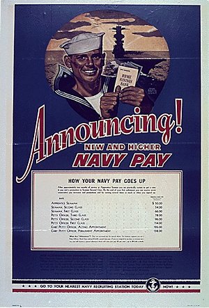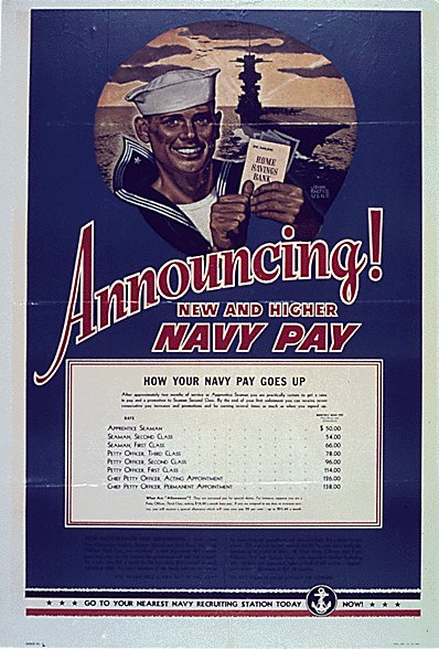 Announcing New and Higher Navy Pay Issued: by the Recruting Office of the US Navy. Measures: Artist: John Falter Our section: Recruitment - Men - Navy GIN: 17-0626 ARC: 513511
