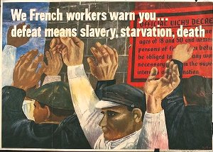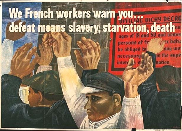 We French Workers Warn You Defeat Means Slavery, Starvation, Death Artist: Ben Shahn Poster marked O.W.I. no. 17 Measures approx. 28" x 40" Issued in 1942 by the U.S. Office of War Information. Our section: Support - Propaganda GIN: 0207-05