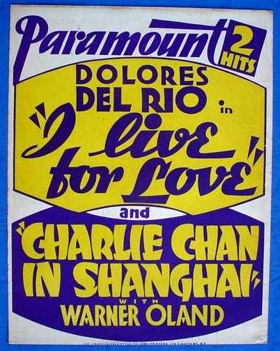 measures 21x27 on card stock. NOTICE: this piece is really cool. I Live for Love is a WB film and Charlie Chan in Shanghai is a Fox Film.... but notice the Paramount across the top.. This trolley card was for the Paramount theater in San Francisco which was built in 1931.